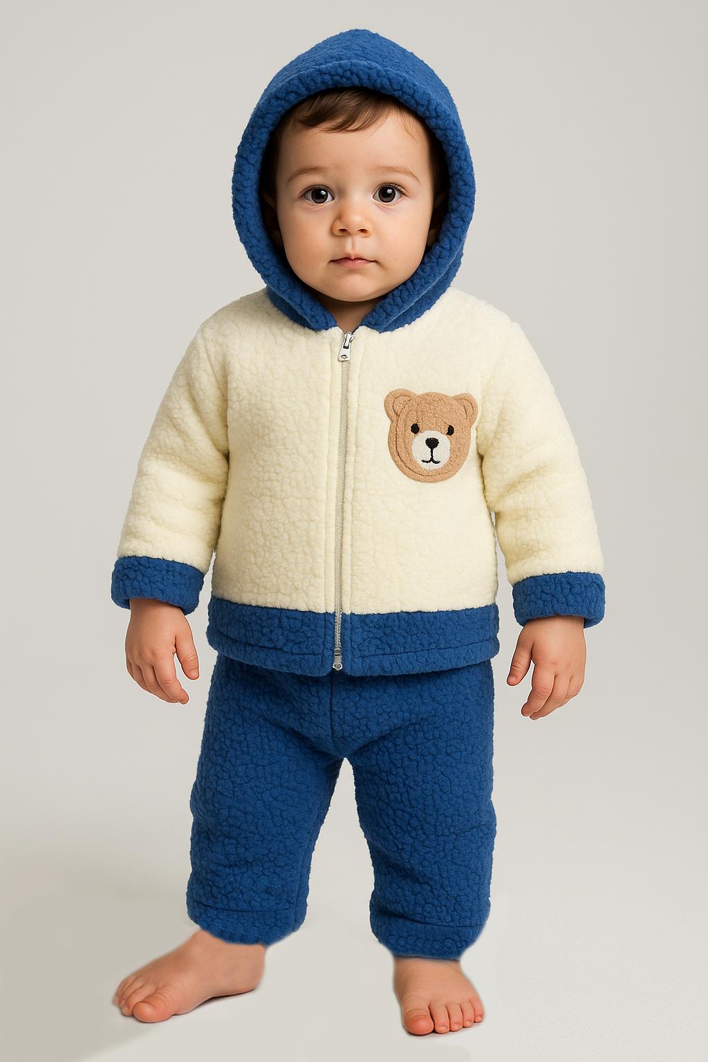 Ayı Nakışlı Kışlık Peluş Welsoft 2'li Kapüşonlu Takım-Mavi (BB2025MD105-Mavi-6-9 ay)